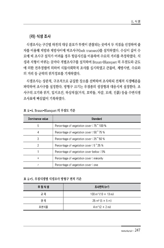 ii. 식 생 www.nie.re.kr ?247 식생조사는 구간별 하천의 대상 분포가 뚜렷이 관찰되는 곳에서 두 지점을 선정하여 줄 자를 이용해 제방과 제방사이에 띠조사구 belt transect 를 설치하였다. 수심이 깊어 수 로에 띠 조사구 설치가 어려울 경우 항공사진을 이용하여 수로의 거리를 측정하였다. 식 생과 지형이 바뀌는 곳마다 개별조사구를 설치하여 Braun-Blanquet 의 우점도와 군도 에 의한 전추정법에 의하여 식물사회학적 조사를 실시하였고 큰물터, 제방사면, 수로와 의 거리 등 군락의 위치정보를 기재하였다. 식생조사는 상관적, 구조적으로 균질한 장소를 선택하여 조사하되 전체적 식생배분을 파악하여 조사구를 설정한다. 방형구 크기는 우점종의 생장형과 대응시켜 설정한다. 조 사구의 크기와 위...