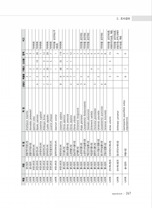 247 목명 과명 국 명 학 명 선달산 옥돌봉 구룡산 신선봉 합계 비고 나비목 밤나방과 흰줄까마귀밤나방 Amphipyra tripartita 2 2 나비목 밤나방과 흰줄이끼밤나방 Stenoloba jankowskii 1 2 3 나비목 부전나비과 귤빛부전나비 Japonica lutea 1 1 적색목록 나비목 부전나비과 범부전나비 Rapala caerulea 4 2 12 10 28 적색목록 나비목 부전나비과 산푸른부전나비 Celastrina sugitanii 1 1 적색목록 나비목 부전나비과 쇳빛부전나비 Ahlbergia ferrea 1 2 6 3 12 나비목 부전나비과 암먹부전나비 Cupido argiades 2 4 20 2 28 적색목록 나비목 부전나비과 작...