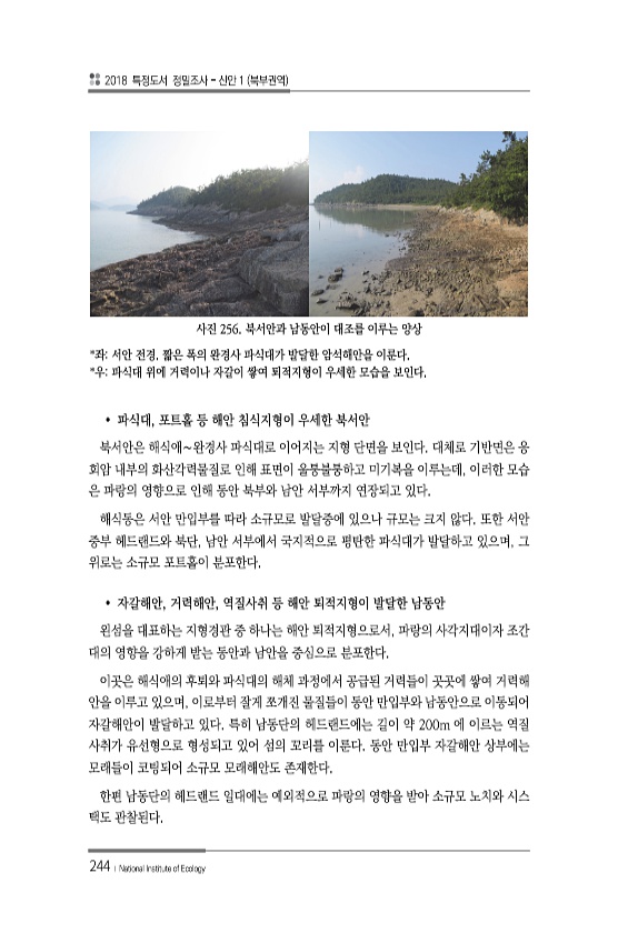 2018 특정도서 정밀조사 신안 1 북부권역 244 ? National Institute of Ecology 사진 256. 북서안과 남동안이 대조를 이루는 양상 *좌서안 전경. 짧은 폭의 완경사 파식대가 발달한 암석해안을 이룬다. *우파식대 위에 거력이나 자갈이 쌓여 퇴적지형이 우세한 모습을 보인다. ? 파식대, 포트홀 등 해안 침식지형이 우세한 북서안 북서안은 해식애∼완경사 파식대로 이어지는 지형 단면을 보인다. 대체로 기반면은 응 회암 내부의 화산각력물질로 인해 표면이 울퉁불퉁하고 미기복을 이루는데, 이러한 모습 은 파랑의 영향으로 인해 동안 북부와 남안 서부까지 연장되고 있다. 해식동은 서안 만입부를 따라 소규모로 발달중에 있으나 규모는 크지 않다. 또한 서안 중부 헤드랜드와 북단, 남안 서부에서 국지...
