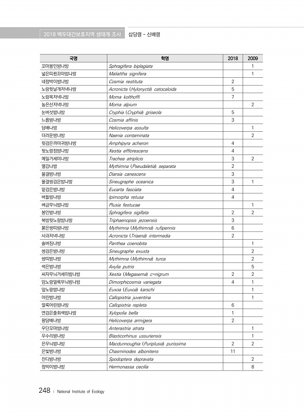 2018 백두대간보호지역 생태계 조사 삽당령 신배령 248 ? National Institute of Ecology 국명 학명 2018 2009 꼬마봉인밤나방 Sphragifera biplagiata 1 넓은띠흰꼬마밤나방 Maliattha signifera 1 네점박이밤나방 Cosmia restituta 2 노랑뒷날개저녁나방 Acronicta Hylonycta catocaloida 5 노랑목저녁나방 Moma kolthoffi 7 높은산저녁나방 Moma alpium 2 눈버섯밤나방 Cryphia Cryphia griseola 5 느릅밤나방 Cosmia affinis 3 담배나방 Helicoverpa assulta 1 더러운밤나방 Naenia contaminata 2 뒷검은까마귀밤나방 Amphipyra ache...