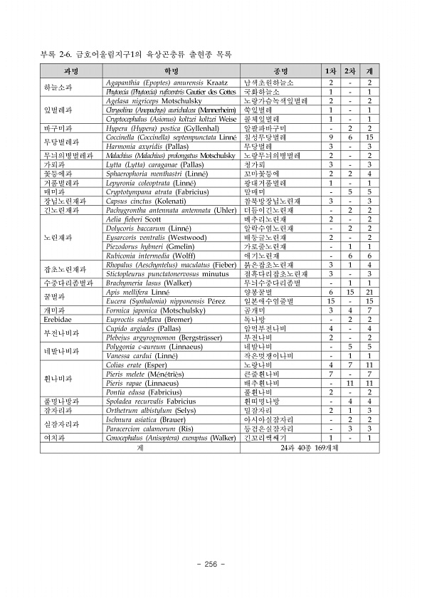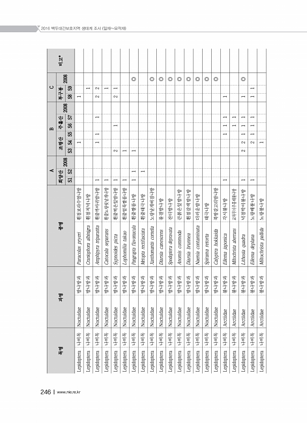 2016 백두대간보호지역 생태계 조사 밀재묘적재 246Ⅰwww.nie.re.kr 목명 과명 종명 A B C 희양산 비고* 2008 조령산 주흘산 2008 투구봉 2008 S1 S2 S3 S4 S5 S6 S7 S8 S9 Lepidoptera 나비목 Noctuidae 밤나방과 Paracolax pryeri 흰점보라수염나방 1 1 Lepidoptera 나비목 Noctuidae 밤나방과 Craniophora albinigra 흰점저녁나방 1 Lepidoptera 나비목 Noctuidae 밤나방과 Amphipyra triparatita 흰줄까마귀밤나방 1 1 1 1 2 2 Lepidoptera 나비목 Noctuidae 밤나방과 Catocala separans 흰줄노랑뒷날개나방 1 1 Lepidoptera 나비목 No...