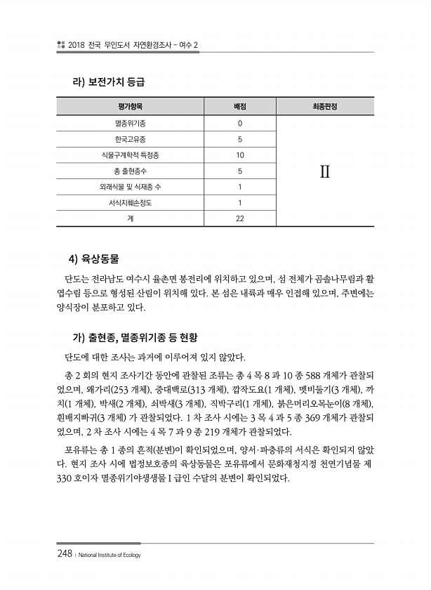 2018 전국 무인도서 자연환경조사 여수 2 248 ? National Institute of Ecology 평가항목 배점 최종판정 멸종위기종 0 Ⅱ 한국고유종 5 식물구계학적 특정종 10 총 출현종수 5 외래식물 및 식재종 수 1 서식지훼손정도 1 계 22 4 단도는 전라남도 여수시 율촌면 봉전리에 위치하고 있으며, 섬 전체가 곰솔나무림과 활 엽수림 등으로 형성된 산림이 위치해 있다. 본 섬은 내륙과 매우 인접해 있으며, 주변에는 양식장이 분포하고 있다. , 단도에 대한 조사는 과거에 이루어져 있지 않았다. 총 2 회의 현지 조사기간 동안에 관찰된 조류는 총 4 목 8 과 10 종 588 개체가 관찰되 었으며, 왜가리 253 개체 , 중대백로 313 개체 , 깝작도요 1 개체 , 멧비둘기 3 개체 , 까 ...