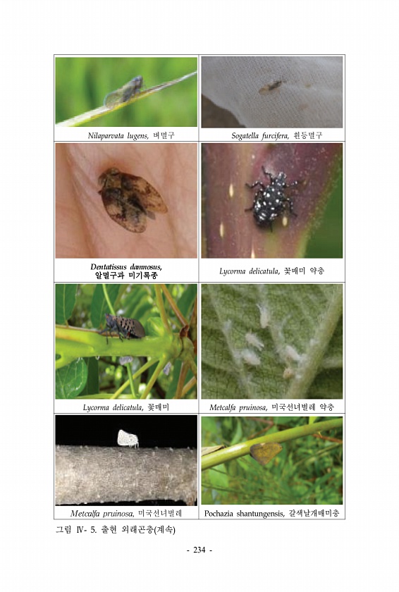 Nilaparvata lugens, 벼멸구 Sogatella furcifera, 흰등멸구 Dentatissus damnosus, 알멸구과 미기록종 Lycorma delicatula, 꽃매미 약충 Lycorma delicatula, 꽃매미 Metcalfa pruinosa, 미국선녀벌레 약충 Metcalfa pruinosa, 미국선녀벌레 Pochazia shantungensis, 갈색날개매미충 그림 Ⅳ- 5. 출현 외래곤충 계속 234