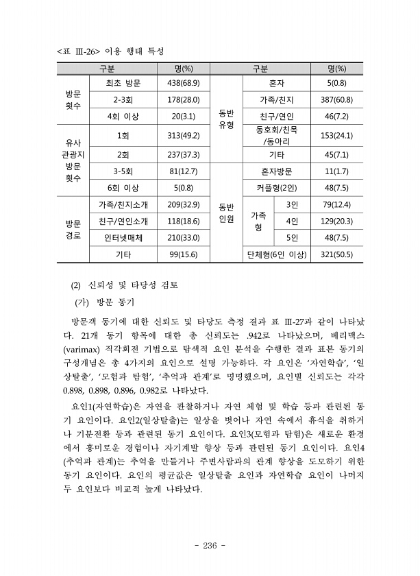 236 구분 명 % 구분 명 % 방문 횟수 최초 방문 438 68.9 동반 유형 혼자 5 0.8 2-3회 178 28.0 가족/친지 387 60.8 4회 이상 20 3.1 친구/연인 46 7.2 유사 관광지 방문 횟수 1회 313 49.2 동호회/친목 /동아리 153 24.1 2회 237 37.3 기타 45 7.1 3-5회 81 12.7 동반 인원 혼자방문 11 1.7 6회 이상 5 0.8 커플형 2인 48 7.5 방문 경로 가족/친지소개 209 32.9 가족 형 3인 79 12.4 친구/연인소개 118 18.6 4인 129 20.3 인터넷매체 210 33.0 5인 48 7.5 기타 99 15.6 단체형 6인 이상 321 50.5 표 이용 행태 특성 신뢰성 및 타당성 검토 가 방문 동기 방문객 동기에 대한 ...