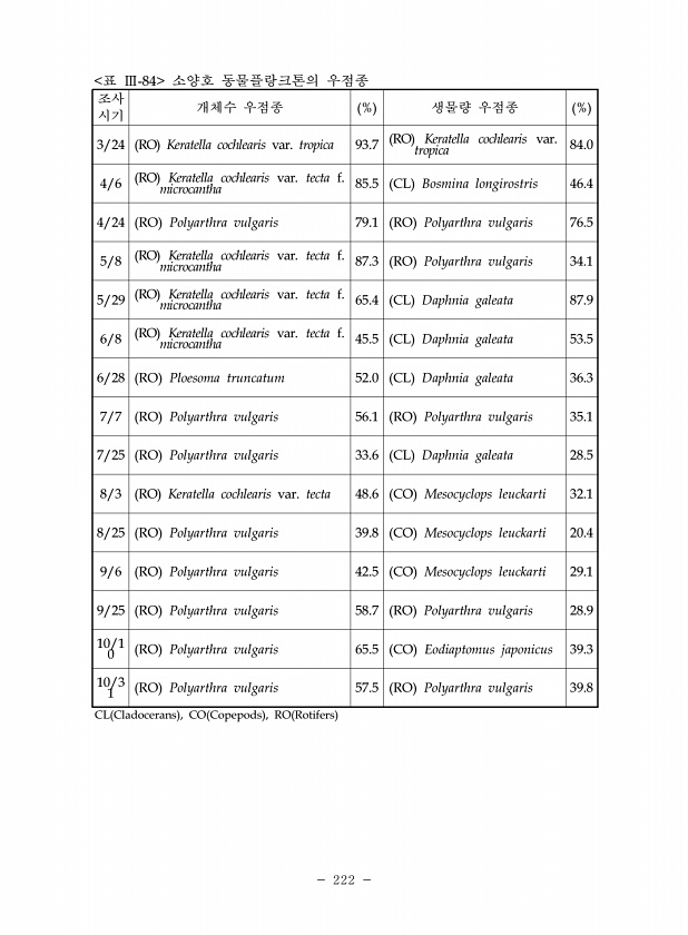222 표 Ⅲ-84 소양호 동물플랑크톤의 우점종 조사 시기 개체수 우점종 % 생물량 우점종 % 3/24 RO Keratella cochlearis var. tropica 93.7 RO tropica Keratella cochlearis var. 84.0 4/6 RO microcantha Keratella cochlearis var. tecta f. 85.5 CL Bosmina longirostris 46.4 4/24 RO Polyarthra vulgaris 79.1 RO Polyarthra vulgaris 76.5 5/8 RO microcantha Keratella cochlearis var. tecta f. 87.3 RO Polyarthra vulgaris 34.1 5/29 RO microcantha Ke...