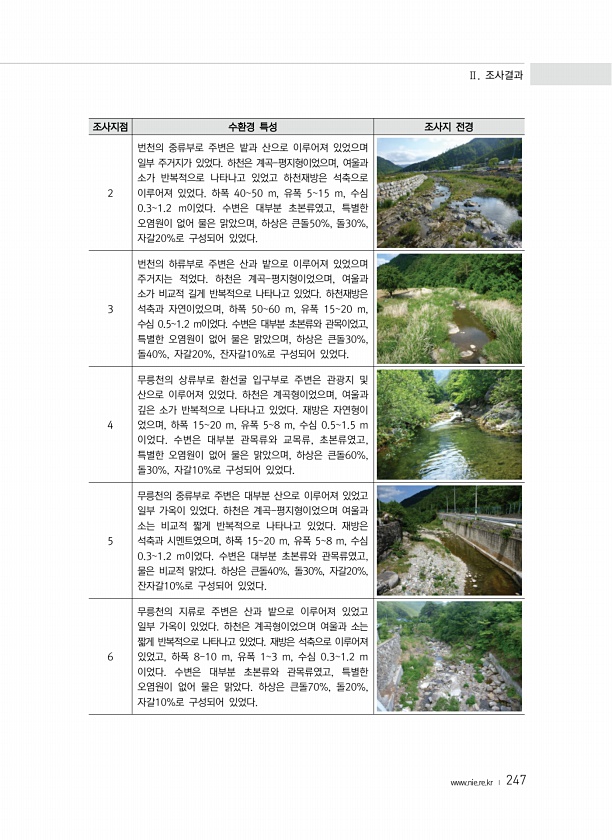 Ⅱ. 조사결과 www.nie.re.kr ? 247 조사지점 수환경 특성 조사지 전경 2 번천의 중류부로 주변은 밭과 산으로 이루어져 있었으며 일부 주거지가 있었다. 하천은 계곡-평지형이었으며, 여울과 소가 반복적으로 나타나고 있었고 하천재방은 석축으로 이루어져 있었다. 하폭 4050 m, 유폭 515 m, 수심 0.31.2 m이었다. 수변은 대부분 초본류였고, 특별한 오염원이 없어 물은 맑았으며, 하상은 큰돌50%, 돌30%, 자갈20%로 구성되어 있었다. 3 번천의 하류부로 주변은 산과 밭으로 이루어져 있었으며 주거지는 적었다. 하천은 계곡-평지형이었으며, 여울과 소가 비교적 길게 반복적으로 나타나고 있었다. 하천재방은 석축과 자연이었으며, 하폭 5060 m, 유폭 1520 m, 수심 0.51.2 m이었다...