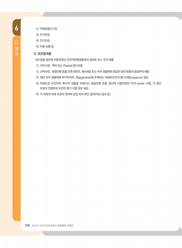 258 _ 환경부 유전자변형생물체 안전관리 가이드 6 별 표 3 다. 위해성평가기관 라. 인가번호 마. 인가자료 바. 이용 상황 등 12. 표준품제출 GM 동물 생산에 이용하였던 유전자변형생물체의 체세포 또는 조직 제출 가. 의무사항 벡터 또는 Plasmid 염기서열 나. 선택사항 형질전환 동물 유래 세포주, 생식세포 또는 숙주 생물체와 동일한 일반 동물의 동일부위 제출 다. 해당 숙주 생물체에 특이적이며, 게놈 genome 에 존재하는 내재유전자의 염기서열 sequence 정보 라. 외래도입 유전자의 특이적 검출을 위해서는 형질전환 동물 생산에 이용하였던 PCR primer 서열, 각 말단 부분의 연결부위 유전자 염기 서열 정보 제공 마. 각 개체의 외래 유전자 염색체 삽입 좌위 확인 결과 FISH 결과 ...