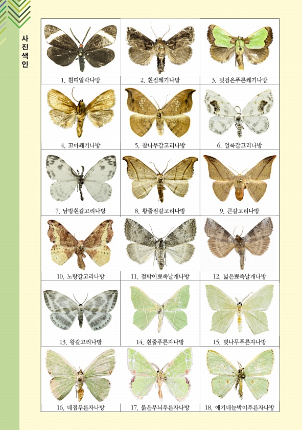 1. 흰띠알락나방 2. 흰점쐐기나방 3. 뒷검은푸른쐐기나방 4. 꼬마쐐기나방 5. 참나무갈고리나방 6. 얼룩갈고리나방 7. 남방흰갈고리나방 8. 황줄점갈고리나방 9. 큰갈고리나방 10. 노랑갈고리나방 11. 점박이뾰족날개나방 12. 넓은뾰족날개나방 13. 왕갈고리나방 14. 흰줄푸른자나방 15. 벚나무푸른자나방 16. 네점푸른자나방 17. 붉은무늬푸른자나방 18. 애기네눈박이푸른자나방사진색인