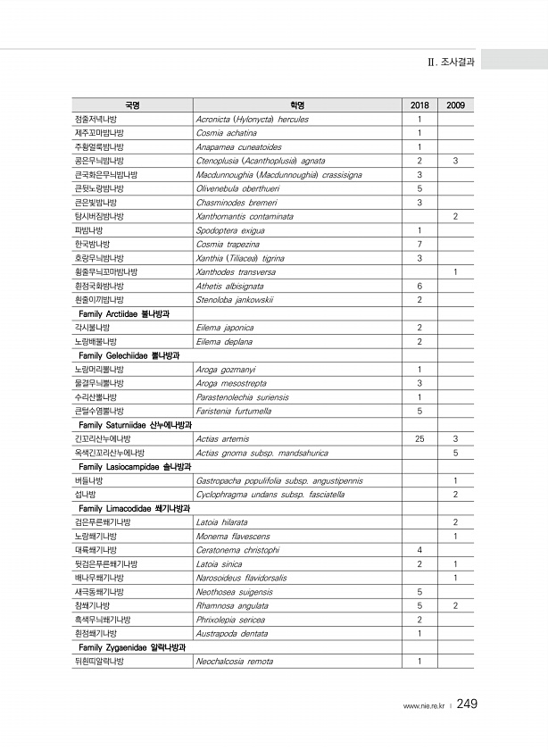Ⅱ. 조사결과 www.nie.re.kr ? 249 국명 학명 2018 2009 점줄저녁나방 Acronicta Hylonycta hercules 1 제주꼬마밤나방 Cosmia achatina 1 주황얼룩밤나방 Anapamea cuneatoides 1 콩은무늬밤나방 Ctenoplusia Acanthoplusia agnata 2 3 큰국화은무늬밤나방 Macdunnoughia Macdunnoughia crassisigna 3 큰뒷노랑밤나방 Olivenebula oberthueri 5 큰은빛밤나방 Chasminodes bremeri 3 탐시버짐밤나방 Xanthomantis contaminata 2 파밤나방 Spodoptera exigua 1 한국밤나방 Cosmia trapezina 7 호랑무늬밤나방 Xanthia T...