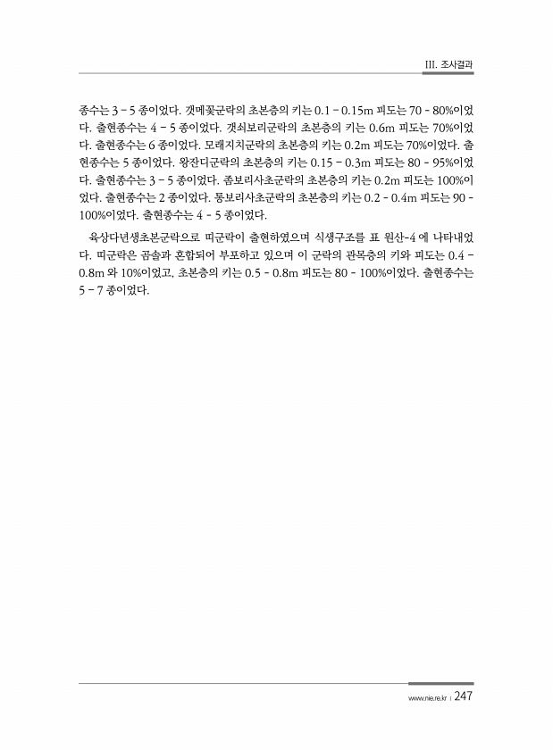 III. 조사결과 www.nie.re.kr ?247 종수는 3 ? 5 종이었다. 갯메꽃군락의 초본층의 키는 0.1 ? 0.15m 피도는 70 80%이었 다. 출현종수는 4 ? 5 종이었다. 갯쇠보리군락의 초본층의 키는 0.6m 피도는 70%이었 다. 출현종수는 6 종이었다. 모래지치군락의 초본층의 키는 0.2m 피도는 70%이었다. 출 현종수는 5 종이었다. 왕잔디군락의 초본층의 키는 0.15 ? 0.3m 피도는 80 95%이었 다. 출현종수는 3 ? 5 종이었다. 좀보리사초군락의 초본층의 키는 0.2m 피도는 100%이 었다. 출현종수는 2 종이었다. 통보리사초군락의 초본층의 키는 0.2 0.4m 피도는 90 100%이었다. 출현종수는 4 5 종이었다. 육상다년생초본군락으로 띠군락이 출현하였으며 식생구조를...