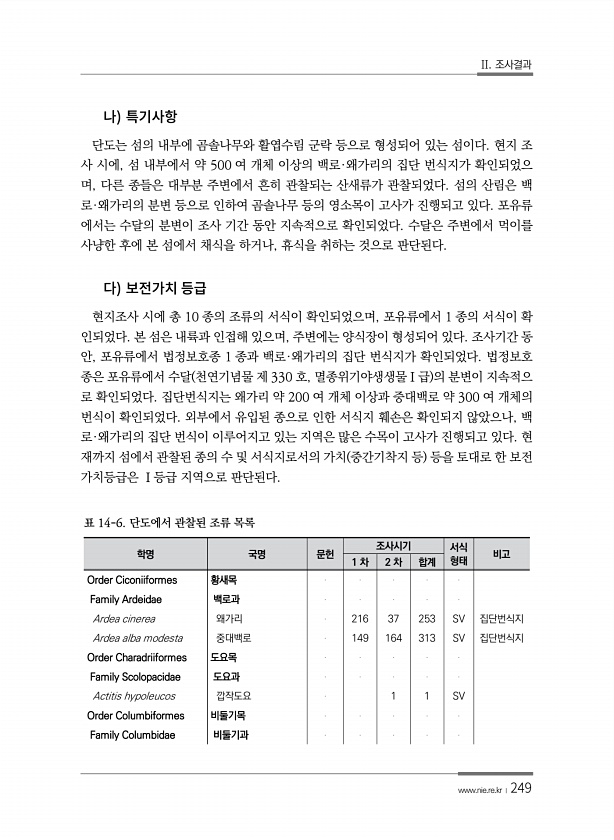 II. 조사결과 www.nie.re.kr ?249 단도는 섬의 내부에 곰솔나무와 활엽수림 군락 등으로 형성되어 있는 섬이다. 현지 조 사 시에, 섬 내부에서 약 500 여 개체 이상의 백로·왜가리의 집단 번식지가 확인되었으 며, 다른 종들은 대부분 주변에서 흔히 관찰되는 산새류가 관찰되었다. 섬의 산림은 백 로·왜가리의 분변 등으로 인하여 곰솔나무 등의 영소목이 고사가 진행되고 있다. 포유류 에서는 수달의 분변이 조사 기간 동안 지속적으로 확인되었다. 수달은 주변에서 먹이를 사냥한 후에 본 섬에서 채식을 하거나, 휴식을 취하는 것으로 판단된다. 현지조사 시에 총 10 종의 조류의 서식이 확인되었으며, 포유류에서 1 종의 서식이 확 인되었다. 본 섬은 내륙과 인접해 있으며, 주변에는 양식장이 형성되어 있다. ...