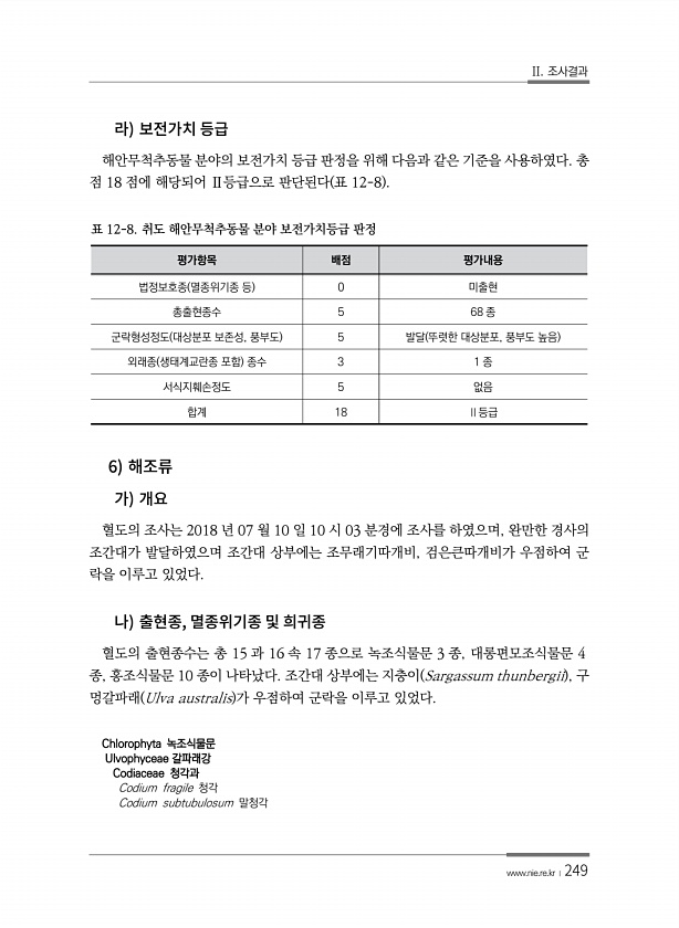 II. 조사결과 www.nie.re.kr ?249 해안무척추동물 분야의 보전가치 등급 판정을 위해 다음과 같은 기준을 사용하였다. 총 점 18 점에 해당되어 Ⅱ등급으로 판단된다 표 12-8 평가항목 배점 평가내용 법정보호종 멸종위기종 등 0 미출현 총출현종수 5 68 종 군락형성정도 대상분포 보존성, 풍부도 5 발달 뚜렷한 대상분포, 풍부도 높음 외래종 생태계교란종 포함 종수 3 1 종 서식지훼손정도 5 없음 합계 18 Ⅱ등급 표 12-8. 취도 해안무척추동물 분야 보전가치등급 판정 6 혈도의 조사는 2018 년 07 월 10 일 10 시 03 분경에 조사를 하였으며, 완만한 경사의 조간대가 발달하였으며 조간대 상부에는 조무래기따개비, 검은큰따개비가 우점하여 군 락을 이루고 있었다. , 혈도의 출현종수는 총...