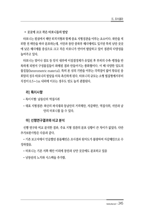 II. 조사결과 www.nie.re.kr ?245 ? 곳곳에 크고 작은 타포니들의 발달 타포니는 왼섬에서 해안 퇴적지형과 함께 중요 지형경관을 이루는 요소이다. 북안을 제 외한 전 해안을 따라 분포하는데, 서안과 동안 중북부 해식애에도 있지만 특히 남안 곳곳 에 낮은 해식애를 중심으로 크고 작은 타포니가 연이어 발달하고 있어 경관의 다양성을 높여주고 있다. 타포니는 염이나 점토 등 암석 내부에 이질결정체가 유입된 후 부피의 수축·팽창을 반 복하게 되면서 구성물질들이 와해된 결과 만들어지는 풍화혈이다. 이 때 다양한 입도의 물질들 heterometric material , 특히 본 섬의 기반을 이루는 각력질이 많이 함유된 응 회암의 경우 타포니의 발달을 더욱 촉진하게 된다. 타포니의 규모는 소형 벌집형에서부터...