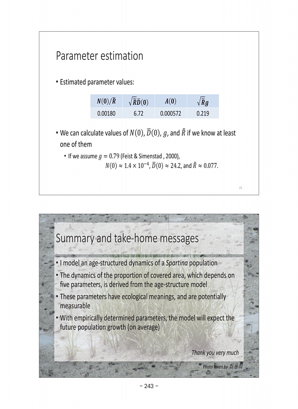 Summary and take-home messages ? I model an age-structured dynamics of a Spartina population ? The dynamics of the proportion of covered area, which depends on five parameters, is derived from the age-structure model ? These parameters have ecological meanings, and are potentially measurable ? With empirically determined parameters, the model will expect the future population growth on average 22 ...