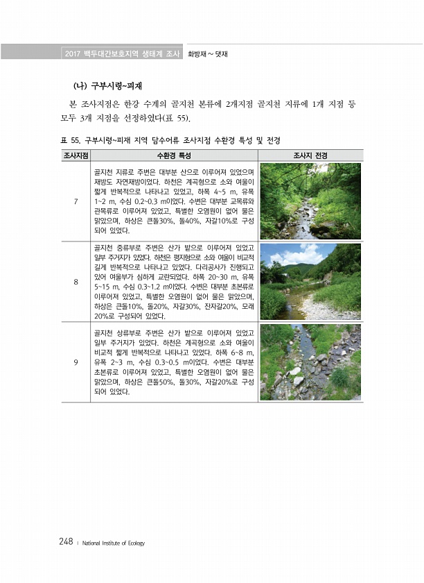 2017 백두대간보호지역 생태계 조사 화방재 댓재 248 ? National Institute of Ecology 나 구부시령피재 본 조사지점은 한강 수계의 골지천 본류에 2개지점 골지천 지류에 1개 지점 등 모두 3개 지점을 선정하였다 표 55 표 55. 구부시령피재 지역 담수어류 조사지점 수환경 특성 및 전경 조사지점 수환경 특성 조사지 전경 7 골지천 지류로 주변은 대부분 산으로 이루어져 있었으며 재방도 자연재방이었다. 하천은 계곡형으로 소와 여울이 짧게 반복적으로 나타나고 있었고, 하폭 45 m, 유폭 12 m, 수심 0.20.3 m이었다. 수변은 대부분 교목류와 관목류로 이루어져 있었고, 특별한 오염원이 없어 물은 맑았으며, 하상은 큰돌30%, 돌40%, 자갈10%로 구성 되어 있었다. 8 골지천 ...