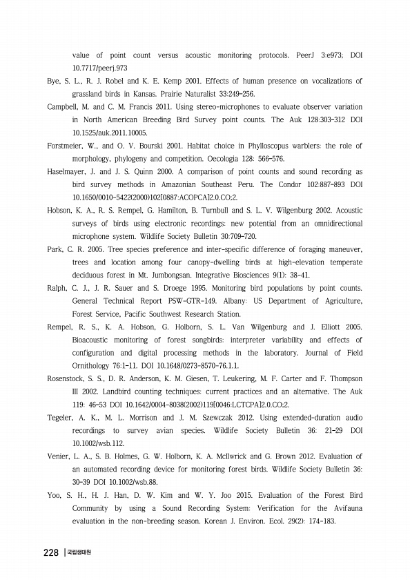 value of point count versus acoustic monitoring protocols. PeerJ 3e973; DOI 10.7717/peerj.973 Bye, S. L., R. J. Robel and K. E. Kemp 2001. Effects of human presence on vocalizations of grassland birds in Kansas. Prairie Naturalist 33249?256. Campbell, M. and C. M. Francis 2011. Using stereo-microphones to evaluate observer variation in North American Breeding Bird Survey point counts. The Auk 1283...