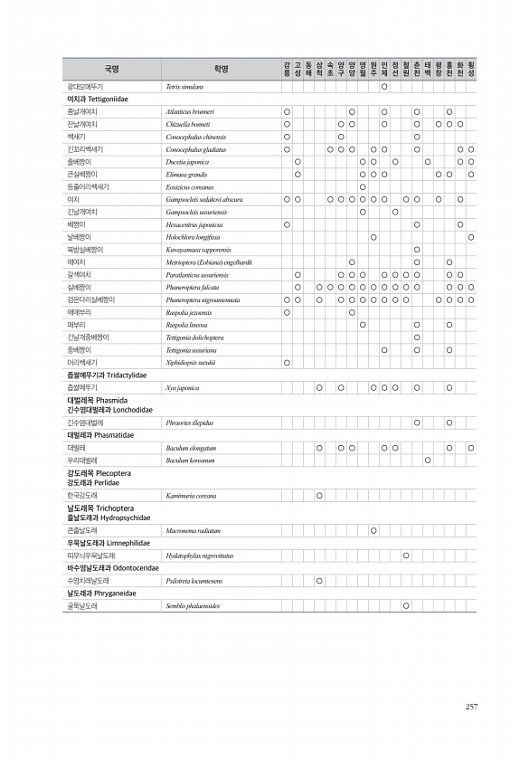 257 광대모메뚜기 Tetrix simulans ○ 여치과 Tettigoniidae 좀날개여치 Atlanticus brunneri ○ ○ ○ ○ ○ 잔날개여치 Chizuella bonneti ○ ○ ○ ○ ○ ○ ○ ○ 쌕새기 Conocephalus chinensis ○ ○ ○ 긴꼬리쌕새기 Conocephalus gladiatus ○ ○ ○ ○ ○ ○ ○ ○ ○ 줄베짱이 Ducetia japonica ○ ○ ○ ○ ○ ○ ○ 큰실베짱이 Elimaea grandis ○ ○ ○ ○ ○ ○ ○ 등줄어리쌕새기 Eoxizicus coreanus ○ 여치 Gampsocleis sedakovi abscura ○ ○ ○ ○ ○ ○ ○ ○ ○ ○ ○ ○ 긴날개여치 Gampsocleis ussuriensis ○ ○ 베짱이 H...