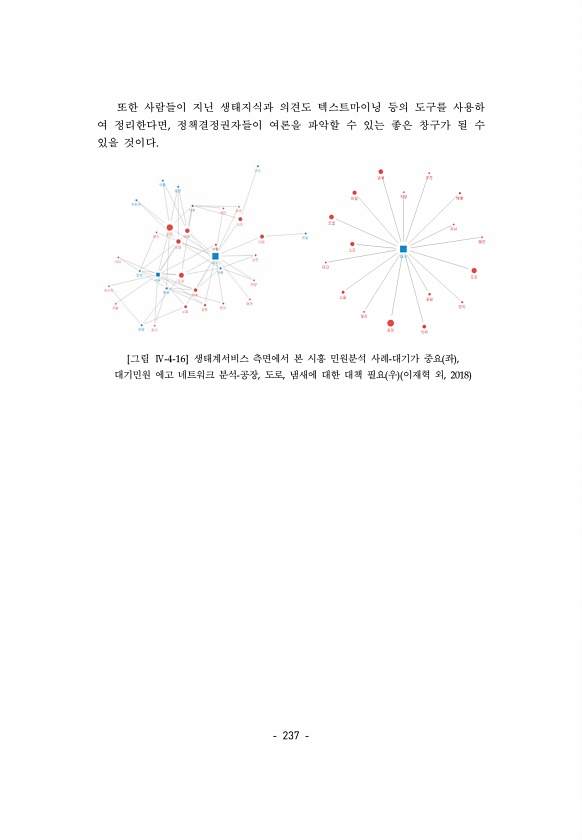 237 또한 사람들이 지닌 생태지식과 의견도 텍스트마이닝 등의 도구를 사용하 여 정리한다면, 정책결정권자들이 여론을 파악할 수 있는 좋은 창구가 될 수 있을 것이다. [그림 Ⅳ-4-16] 생태계서비스 측면에서 본 시흥 민원분석 사례-대기가 중요 좌 , 대기민원 에고 네트워크 분석-공장, 도로, 냄새에 대한 대책 필요 우 이재혁 외, 2018