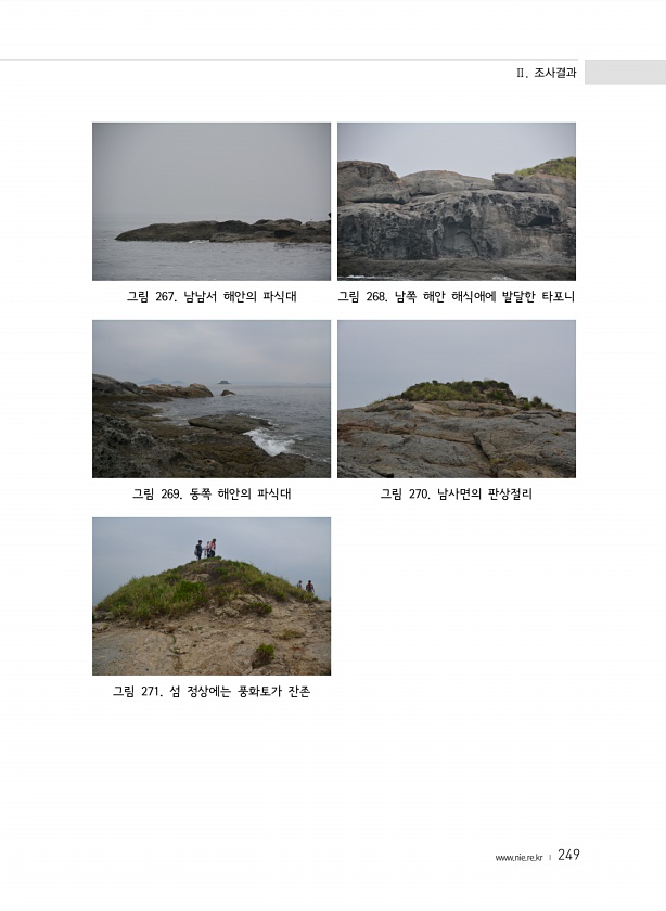 Ⅱ. 조사결과 www.nie.re.kr ? 249 그림 267. 남남서 해안의 파식대 그림 268. 남쪽 해안 해식애에 발달한 타포니 그림 269. 동쪽 해안의 파식대 그림 270. 남사면의 판상절리 그림 271. 섬 정상에는 풍화토가잔존