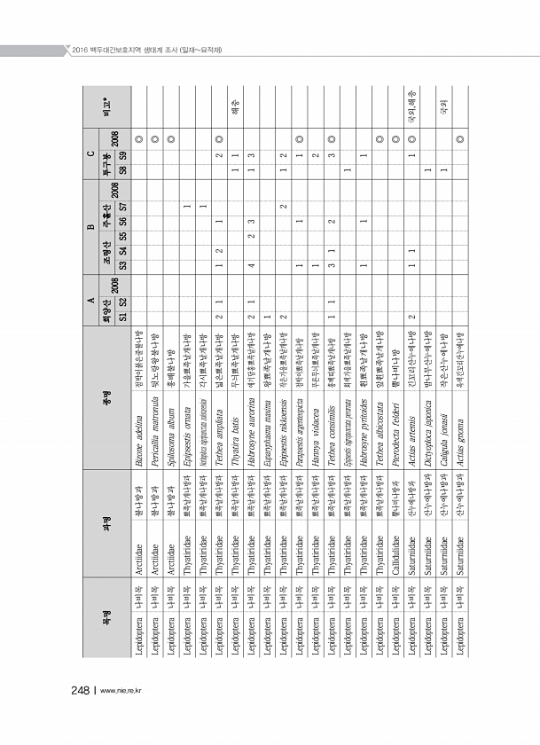 2016 백두대간보호지역 생태계 조사 밀재묘적재 248Ⅰwww.nie.re.kr 목명 과명 종명 A B C 희양산 비고* 2008 조령산 주흘산 2008 투구봉 2008 S1 S2 S3 S4 S5 S6 S7 S8 S9 Lepidoptera 나비목 Arctiidae 불나방과 Bizone adelina 점박이붉은줄불나방 ◎ Lepidoptera 나비목 Arctiidae 불나방과 Pericallia matronula 뒷노랑왕불나방 ◎ Lepidoptera 나비목 Arctiidae 불나방과 Spilosoma album 홍배불나방 ◎ Lepidoptera 나비목 Thyatiridae 뾰족날개나방과 Epipsestis ornata 가을뾰족날개나방 1 Lepidoptera 나비목 Thyatiridae 뾰족날개나방과 No...