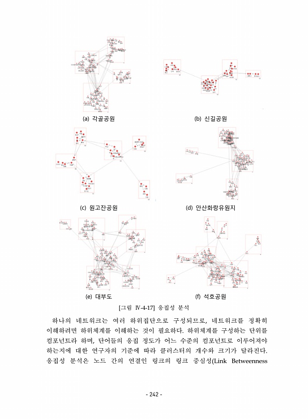 a 각골공원 b 신길공원 c 원고잔공원 d 안산화랑유원지 e 대부도 f 석호공원 [그림 Ⅳ-4-17] 응집성 분석 하나의 네트워크는 여러 하위집단으로 구성되므로, 네트워크를 정확히 이해하려면 하위체계를 이해하는 것이 필요하다. 하위체계를 구성하는 단위를 컴포넌트라 하며, 단어들의 응집 정도가 어느 수준의 컴포넌트로 이루어져야 하는지에 대한 연구자의 기준에 따라 클러스터의 개수와 크기가 달라진다. 응집성 분석은 노드 간의 연결인 링크의 링크 중심성 Link Betweenness 242