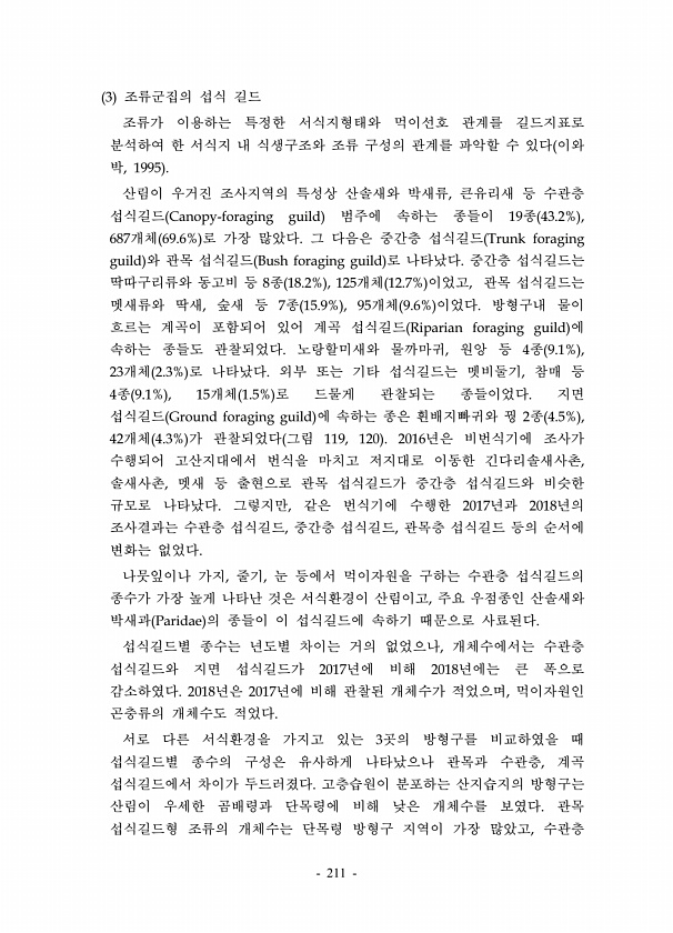 211 3 조류군집의 섭식 길드 조류가 이용하는 특정한 서식지형태와 먹이선호 관계를 길드지표로 분석하여 한 서식지 내 식생구조와 조류 구성의 관계를 파악할 수 있다 이와 박, 1995 산림이 우거진 조사지역의 특성상 산솔새와 박새류, 큰유리새 등 수관층 섭식길드 Canopy-foraging guild 범주에 속하는 종들이 19종 43.2% , 687개체 69.6% 로 가장 많았다. 그 다음은 중간층 섭식길드 Trunk foraging guild 와 관목 섭식길드 Bush foraging guild 로 나타났다. 중간층 섭식길드는 딱따구리류와 동고비 등 8종 18.2% , 125개체 12.7% 이었고, 관목 섭식길드는 멧새류와 딱새, 숲새 등 7종 15.9% , 95개체 9.6% 이었다. 방형구내 물이 흐르는...