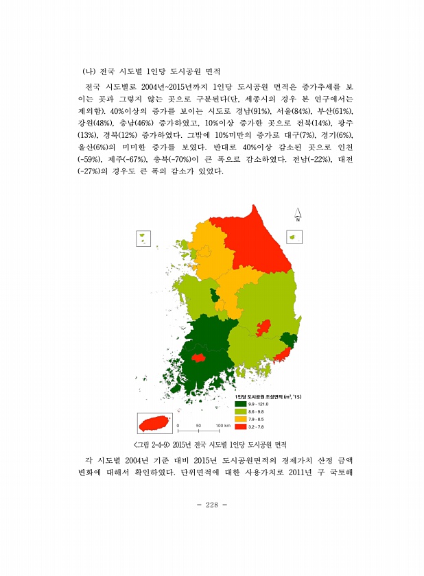 228 나 전국 시도별 1인당 도시공원 면적 전국 시도별로 2004년2015년까지 1인당 도시공원 면적은 증가추세를 보 이는 곳과 그렇지 않는 곳으로 구분된다 단, 세종시의 경우 본 연구에서는 제외함 40%이상의 증가를 보이는 시도로 경남 91% , 서울 84% , 부산 61% , 강원 48% , 충남 46% 증가하였고, 10%이상 증가한 곳으로 전북 14% , 광주 13% , 경북 12% 증가하였다. 그밖에 10%미만의 증가로 대구 7% , 경기 6% , 울산 6% 의 미미한 증가를 보였다. 반대로 40%이상 감소된 곳으로 인천 -59% , 제주 -67% , 충북 -70% 이 큰 폭으로 감소하였다. 전남 -22% , 대전 -27% 의 경우도 큰 폭의 감소가 있었다. 그림 2-4-9 2015년 전국 시도별 ...