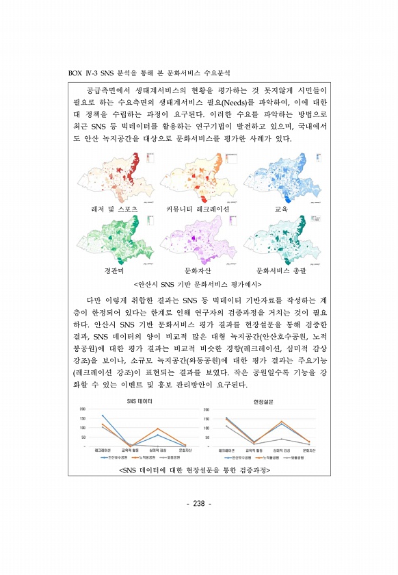 238 공급측면에서 생태계서비스의 현황을 평가하는 것 못지않게 시민들이 필요로 하는 수요측면의 생태계서비스 필요 Needs 를 파악하여, 이에 대한 대 정책을 수립하는 과정이 요구된다. 이러한 수요를 파악하는 방법으로 최근 SNS 등 빅데이터를 활용하는 연구기법이 발전하고 있으며, 국내에서 도 안산 녹지공간을 대상으로 문화서비스를 평가한 사례가 있다. 레저 및 스포츠 커뮤니티 레크레이션 교육 경관미 문화자산 문화서비스 총괄 안산시 SNS 기반 문화서비스 평가예시 다만 이렇게 취합한 결과는 SNS 등 빅데이터 기반자료를 작성하는 계 층이 한정되어 있다는 한계로 인해 연구자의 검증과정을 거치는 것이 필요 하다. 안산시 SNS 기반 문화서비스 평가 결과를 현장설문을 통해 검증한 결과, SNS 데이터의 양이 비교적...