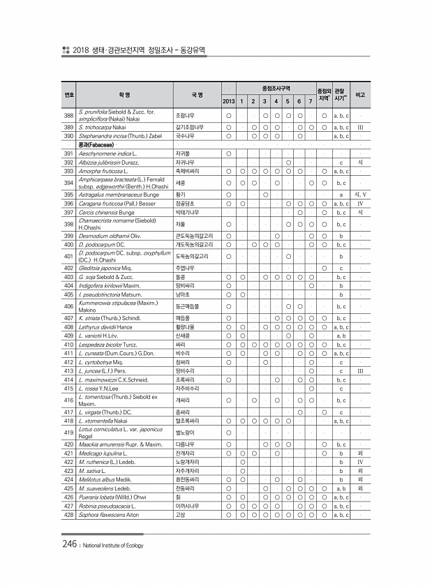 2018 생태·경관보전지역 정밀조사 동강유역 246 ? National Institute of Ecology 번호 학 명 국 명 중점조사구역 중점외 지역* 관찰 시기** 비고 2013 1 2 3 4 5 6 7 388 S. prunifolia Siebold & Zucc. for. simpliciflora Nakai Nakai 조팝나무 ○ ○ ○ ○ ○ ○ a, b, c 389 S. trichocarpa Nakai 갈기조팝나무 ○ ○ ○ ○ ○ ○ ○ a, b, c III 390 Stephanandra incisa Thunb. Zabel 국수나무 ○ ○ ○ ○ ○ a, b, c 콩과 Fabaceae 391 Aeschynomene indica L. 자귀풀 ○ ...