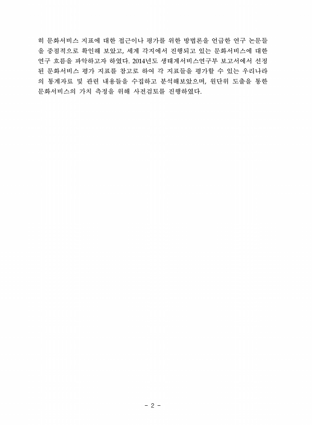 2 히 문화서비스 지표에 대한 접근이나 평가를 위한 방법론을 언급한 연구 논문들 을 중점적으로 확인해 보았고 세계 각지에서 진행되고 있는 문화서비스에 대한 연구 흐름을 파악하고자 하였다 년도 생태계서비스연구부 보고서에서 선정 된 문화서비스 평가 지표를 참고로 하여 각 지표들을 평가할 수 있는 우리나라 의 통계자료 및 관련 내용들을 수집하고 분석해보았으며 원단위 도출을 통한 문화서비스의 가치 측정을 위해 사전검토를진행하였다