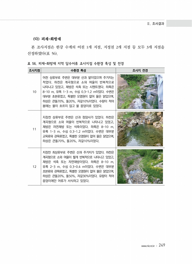 Ⅱ. 조사결과 www.nie.re.kr ? 249 다 피재화방재 본 조사지점은 한강 수계의 어천 1개 지점, 지정천 2개 지점 등 모두 3개 지점을 선정하였다 표 56 표 56. 피재화방재 지역 담수어류 조사지점 수환경 특성 및 전경 조사지점 수환경 특성 조사지 전경 10 어천 상류부로 주변은 대부분 산과 밭이었으며 주거지는 적었다. 하천은 계곡형으로 소와 여울이 반복적으로 나타나고 있었고, 재방은 석축 또는 시멘트였다. 하폭은 810 m, 유폭 13 m, 수심 0.31.2 m이었다. 수변은 대부분 초본류였고, 특별한 오염원이 없어 물은 맑았으며, 하상은 큰돌70%, 돌20%, 자갈10%이었다. 수량이 적어 봄에는 물이 흐르지 않고 물 웅덩이로 있었다. 11 지장천 상류부로 주변은 산과 정암사가 있었다. 하...