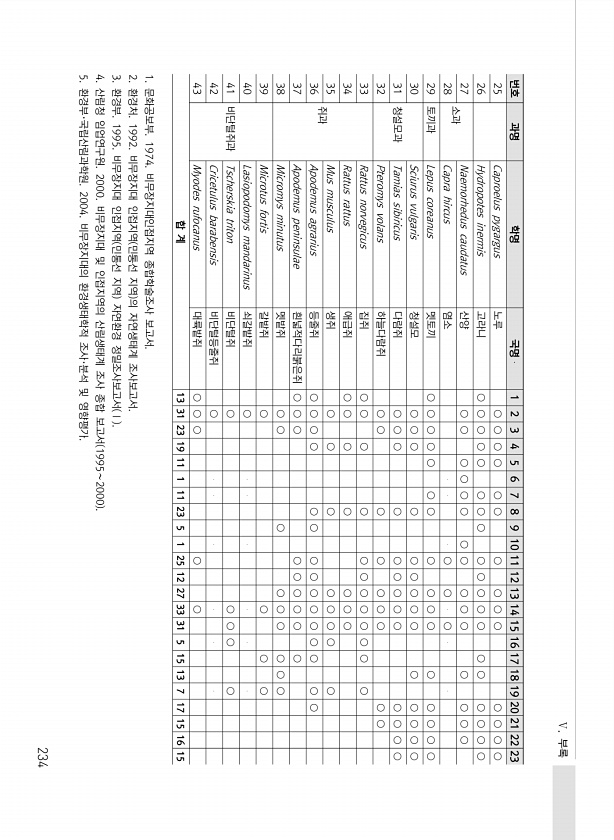 Ⅴ. 부록 234 번호 과명 학명 국명 1 2 3 4 5 6 7 8 9 10 11 12 13 14 15 16 17 18 19 20 21 22 23 25 Caproelus pygargus 노루 ○ ○ ○ ○ ○ ○ ○ ○ ○ ○ ○ ○ ○ ○ 26 Hydropotes inermis 고라니 ○ ○ ○ ○ ○ ○ ○ ○ ○ ○ ○ ○ ○ ○ ○ ○ ○ ○ ○ 27 소과 Naemorhedus caudatus 산양 ○ ○ ○ ○ ○ ○ ○ ○ ○ ○ ○ ○ ○ ○ ○ 28 Capra hircus 염소 ○ ○ ○ 29 토끼과 Lepus coreanus 멧토끼 ○ ○ ○ ○ ○ ○ ○ ○ ○ ○ ○ ○ ○ ○ ○ ○ 30 청설모과 Sciurus vulgaris 청설모 ○ ○ ○ ○ ○ ○ ○ ○ ○ ○ ○ ○ ...