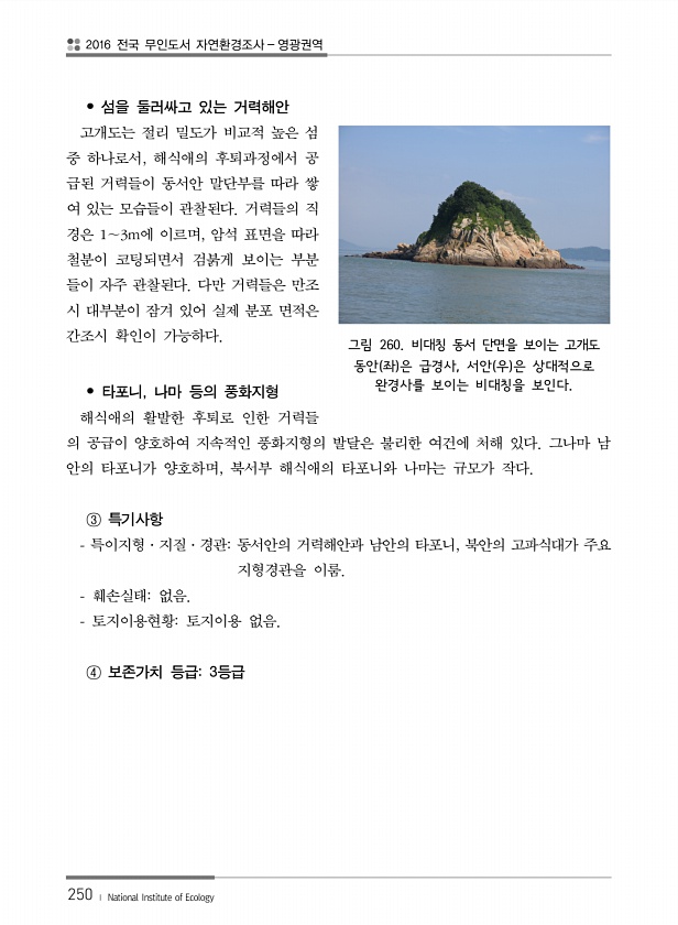 2016 전국 무인도서 자연환경조사 영광권역 250 ? National Institute of Ecology 그림 260. 비대칭 동서 단면을 보이는 고개도 동안 좌 은 급경사, 서안 우 은 상대적으로 완경사를 보이는 비대칭을 보인다. ? 섬을 둘러싸고 있는 거력해안 고개도는 절리 밀도가 비교적 높은 섬 중 하나로서, 해식애의 후퇴과정에서 공 급된 거력들이 동서안 말단부를 따라 쌓 여 있는 모습들이 관찰된다. 거력들의 직 경은 1∼3m에 이르며, 암석 표면을 따라 철분이 코팅되면서 검붉게 보이는 부분 들이 자주 관찰된다. 다만 거력들은 만조 시 대부분이 잠겨 있어 실제 분포 면적은 간조시 확인이 가능하다. ? 타포니, 나마 등의 풍화지형 해식애의 활발한 후퇴로 인한 거력들 의 공급이 양호하여 지속적인 풍화지...