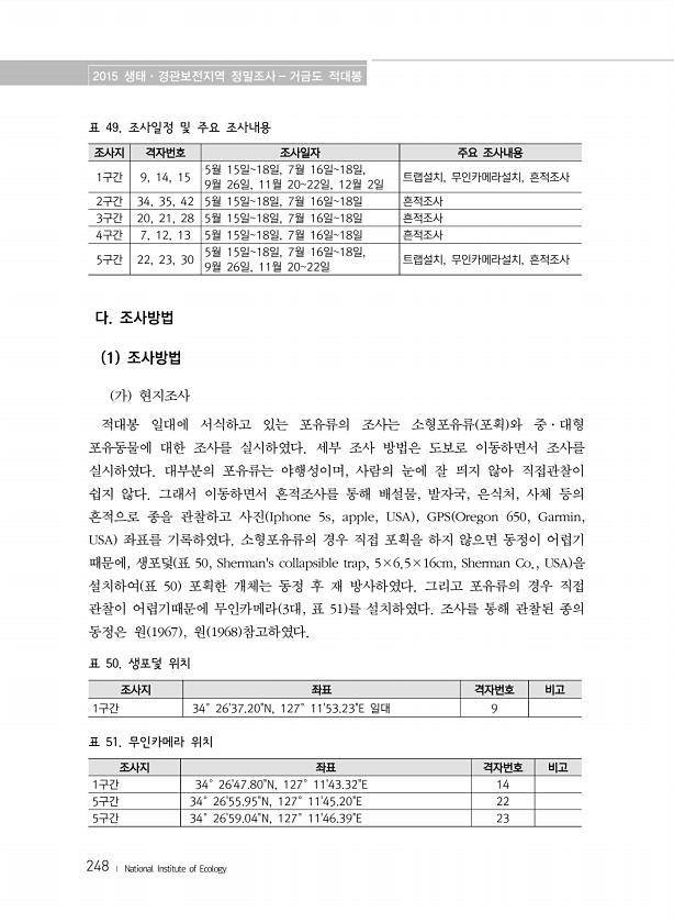 2015 생태·경관보전지역 정밀조사 거금도 적대봉 248 ? National Institute of Ecology 조사지 격자번호 조사일자 주요 조사내용 1구간 9, 14, 15 5월 15일18일, 7월 16일18일, 9월 26일, 11월 2022일, 12월 2일 트랩설치, 무인카메라설치, 흔적조사 2구간 34, 35, 42 5월 15일18일, 7월 16일18일 흔적조사 3구간 20, 21, 28 5월 15일18일, 7월 16일18일 흔적조사 4구간 7, 12, 13 5월 15일18일, 7월 16일18일 흔적조사 5구간 22, 23, 30 5월 15일18일, 7월 16일18일, 9월 26일, 11월 2022일 트랩설치, 무인카메라설치, 흔적조사 표 49. 조사일정 및 주요 조사내용 다. 조사방법 1 조사방법...
