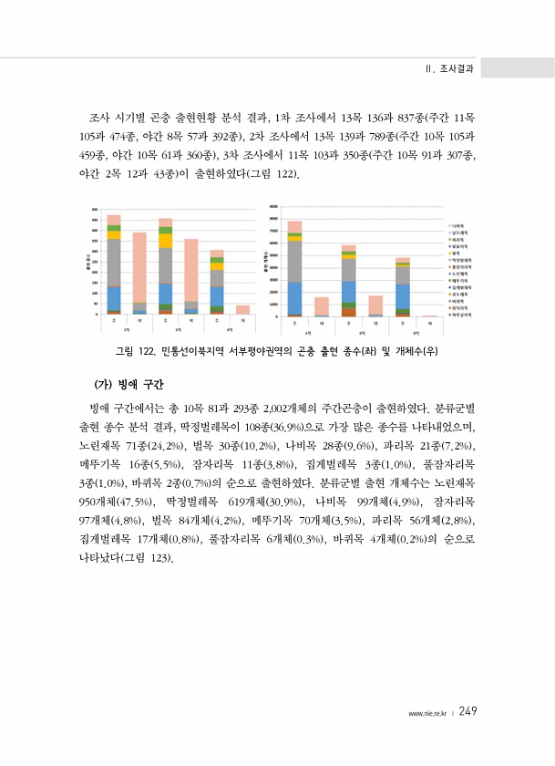 Ⅱ. 조사결과 www.nie.re.kr ? 249 조사 시기별 곤충 출현현황 분석 결과, 1차 조사에서 13목 136과 837종 주간 11목 105과 474종, 야간 8목 57과 392종 , 2차 조사에서 13목 139과 789종 주간 10목 105과 459종, 야간 10목 61과 360종 , 3차 조사에서 11목 103과 350종 주간 10목 91과 307종, 야간 2목 12과 43종 이 출현하였다 그림 122 그림 122. 민통선이북지역 서부평야권역의 곤충 출현 종수 좌 및 개체수 우 가 빙애 구간 빙애 구간에서는 총 10목 81과 293종 2,002개체의 주간곤충이 출현하였다. 분류군별 출현 종수 분석 결과, 딱정벌레목이 108종 36.9% 으로 가장 많은 종수를 나타내었으며, 노린재목 71종 24.2...