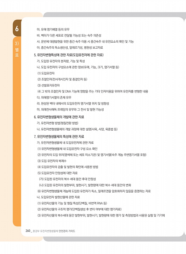 260 _ 환경부 유전자변형생물체 안전관리 가이드 6 별 표 3 마. 유해 염기배열 등의 유무 바. 벡터가 다른 세포로 전달될 가능성 또는 숙주 의존성 사. 운반체 대량발현을 위한 중간 숙주 이용 시 중간숙주 내 유전요소의 확인 및 기능 아. 중간숙주의 독소생산성, 알레르기성, 병원성 보고자료 5. 유전자변형특성에 관한 자료 도입유전자에 관한 자료 가. 도입된 유전자의 분자량, 기능 및 특성 나. 도입 유전자의 구성요소에 관한 정보 유래, 기능, 크기, 염기서열 등 1 도입유전자 2 조절인자 전사개시인자 및 종결인자 등 3 선발표지유전자 4 그 밖의 조절인자 및 DNA 기능에 영향을 주는 기타 인자이용을 위하여 유전자를 변형한 내용 다. 위해염기서열의 존재 유무 라. 완성된 벡터 내에서의 도입유전자 염기서열...