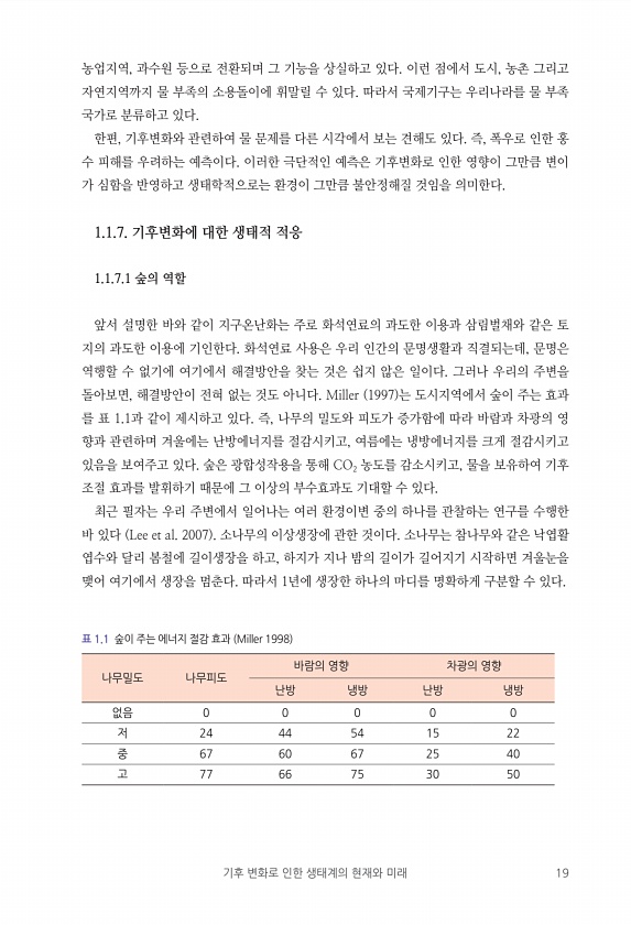 기후 변화로 인한 생태계의 현재와 미래 19 농업지역, 과수원 등으로 전환되며 그 기능을 상실하고 있다. 이런 점에서 도시, 농촌 그리고 자연지역까지 물 부족의 소용돌이에 휘말릴 수 있다. 따라서 국제기구는 우리나라를 물 부족 국가로 분류하고 있다. 한편, 기후변화와 관련하여 물 문제를 다른 시각에서 보는 견해도 있다. 즉, 폭우로 인한 홍 수 피해를 우려하는 예측이다. 이러한 극단적인 예측은 기후변화로 인한 영향이 그만큼 변이 가 심함을 반영하고 생태학적으로는 환경이 그만큼 불안정해질 것임을 의미한다. 1.1.7. 기후변화에 대한 생태적 적응 1.1.7.1 숲의 역할 앞서 설명한 바와 같이 지구온난화는 주로 화석연료의 과도한 이용과 삼림벌채와 같은 토 지의 과도한 이용에 기인한다. 화석연료 사용은 우리 인...