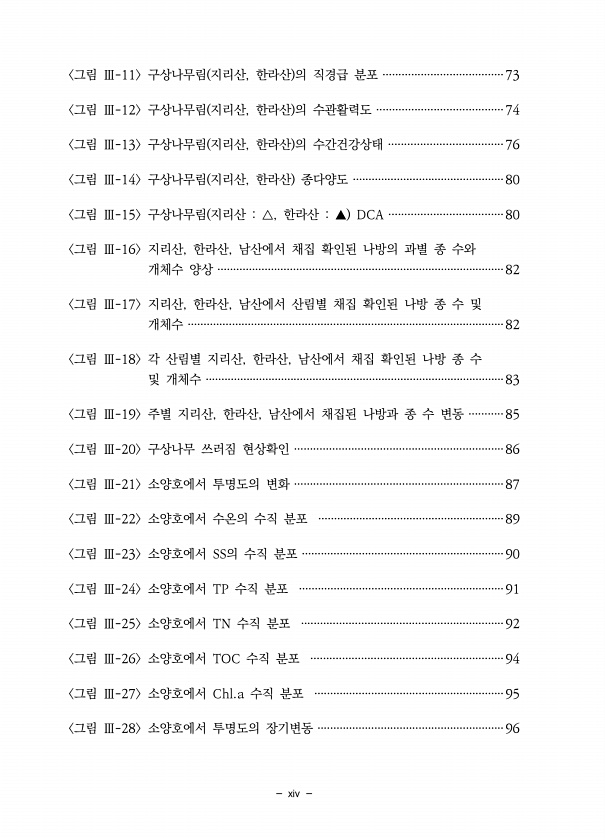 xiv 그림 Ⅲ-11 구상나무림 지리산, 한라산 의 직경급 분포 ······································73 그림 Ⅲ-12 구상나무림 지리산, 한라산 의 수관활력도 ········································74 그림 Ⅲ-13 구상나무림 지리산, 한라산 의 수간건강상태 ····································76 그림 Ⅲ-14 구상나무림 지리산, 한라산 종다양도 ················································80 그림 Ⅲ-15 구상나무림 지리산 △, 한라산 ▲ DCA ····································80 그림 Ⅲ-16 지리산, 한라산, 남산에서 채집 확인된...