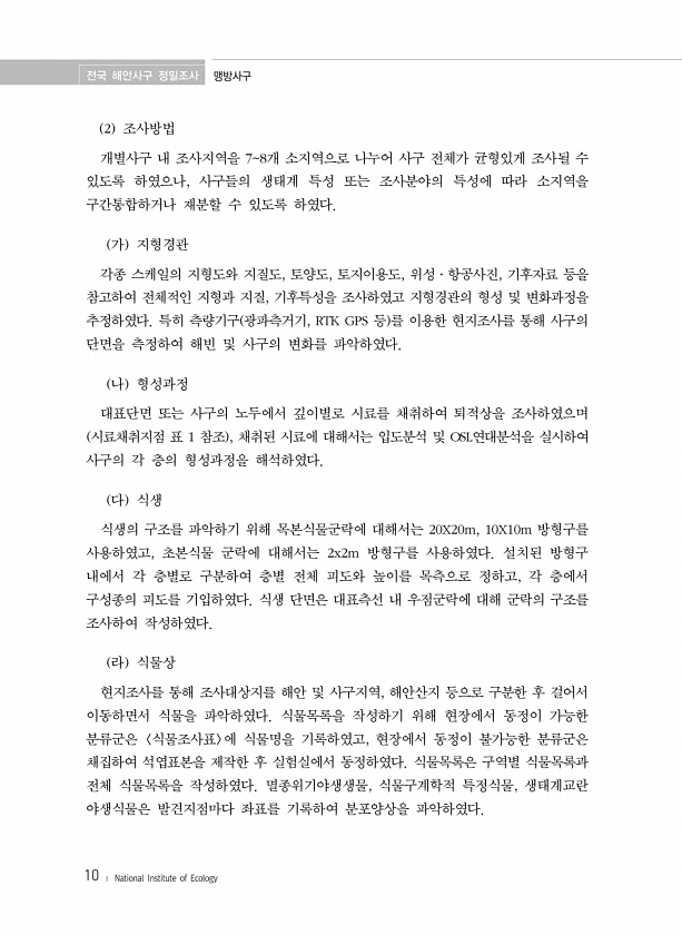 전국 해안사구 정밀조사 맹방사구 10 ? National Institute of Ecology 2 조사방법 개별사구 내 조사지역을 78개 소지역으로 나누어 사구 전체가 균형있게 조사될 수 있도록 하였으나, 사구들의 생태계 특성 또는 조사분야의 특성에 따라 소지역을 구간통합하거나 재분할 수 있도록 하였다. 가 지형경관 각종 스케일의 지형도와 지질도, 토양도, 토지이용도, 위성·항공사진, 기후자료 등을 참고하여 전체적인 지형과 지질, 기후특성을 조사하였고 지형경관의 형성 및 변화과정을 추정하였다. 특히 측량기구 광파측거기, RTK GPS 등 를 이용한 현지조사를 통해 사구의 단면을 측정하여 해빈 및 사구의 변화를 파악하였다. 나 형성과정 대표단면 또는 사구의 노두에서 깊이별로 시료를 채취하여 퇴적상을 조사하였으...