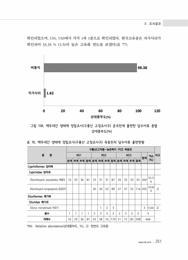 Ⅱ. 조사결과 www.nie.re.kr ? 251 확인되었으며, US1, US3에서 각각 1과 1종으로 확인되었다. 한국고유종은 자가사리가 확인되어 33.33 % 1/3 의 높은 고유화 빈도를 보였다 표 77 그림 106. 백두대간 생태계 정밀조사 구룡산 고정조사구 운곡천에 출현한 담수어류 종별 상대풍부도 % 표 76. 백두대간 생태계 정밀조사 구룡산 고정조사구 옥동천의 담수어류 출현현황 종 명 구룡산 고직령∼늦은목이 구간 옥동천 NS1 NS2 NS3 비고 합계 *RA 춘계 하계 추계 합계 춘계 하계 추계 합계 춘계 하계 추계 합계 % Cypriniformes 잉어목 Cyprinidae 잉어과 Rhynchocypris oxycephalus 버들치 16 29 36 81 25 31 31 87 24 35 33 9...