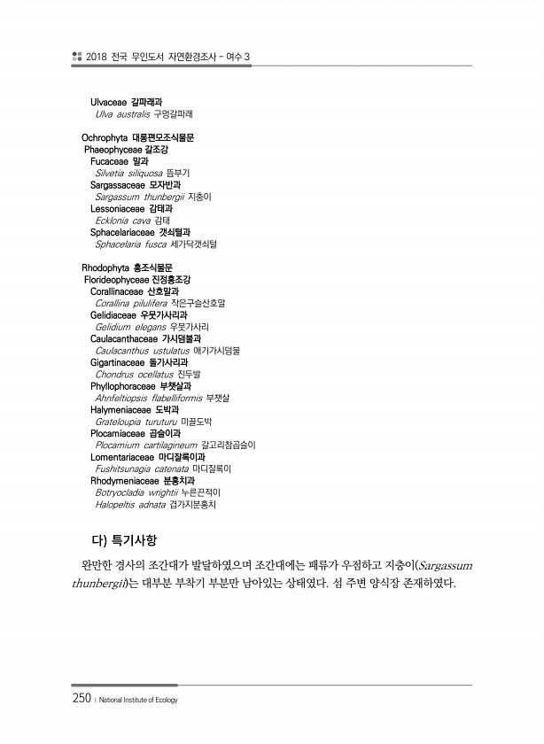 2018 전국 무인도서 자연환경조사 여수 3 250 ? National Institute of Ecology Ulvaceae 갈파래과 Ulva australis 구멍갈파래 Ochrophyta 대롱편모조식물문 Phaeophyceae 갈조강 Fucaceae 말과 Silvetia siliquosa 뜸부기 Sargassaceae 모자반과 Sargassum thunbergii 지충이 Lessoniaceae 감태과 Ecklonia cava 감태 Sphacelariaceae 갯쇠털과 Sphacelaria fusca 세가닥갯쇠털 Rhodophyta 홍조식물문 Florideophyceae 진정홍조강 Corallinaceae 산호말과 Corallina pilulifera 작은구슬산호말 Gelidiaceae 우뭇가사리과 Gel...
