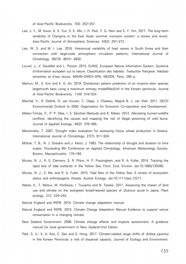 239 of Asia-Pacific Biodiversity. 7 3 252-257. Lee, J. Y., M. Kwon, K. S. Yun, S. K. Min, I. H. Park, Y. G. Ham and S. Y. Yim, 2017. The long-term variability of Changma in the East Asian summer monsoon systema review and revisit. Asia-Pacific Journal of Atmospheric Sciences. 53 2 257-272. Lee, W. S. and M. I. Lee. 2016. Interannual variability of heat waves in South Korea and their connection wit...