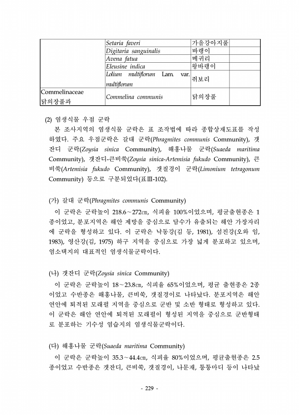 229 Setaria faveri 가을강아지풀 Digitaria sanguinalis 바랭이 Avena fatua 메귀리 Eleusine indica 왕바랭이 Lolium multiflorum Lam. var. multiflorum 쥐보리 Commelinaceae 닭의장풀과 Commelina communis 닭의장풀 2 염생식물 우점 군락 본 조사지역의 염생식물 군락은 표 조작법에 따라 종합상재도표를 작성 하였다. 주요 우점군락은 갈대 군락 Phragmites communis Community , 갯 잔디 군락 Zoysia sinica Community , 해홍나물 군락 Suaeda maritima Community , 갯잔디-큰비쑥 Zoysia sinica-Artemisia fukudo Community ...