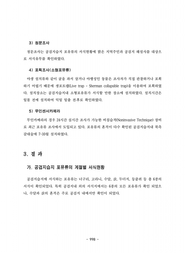 998 3 청문조사 청문조사는 공검지습지 포유류의 서식현황에 밝은 지역주민과 공검지 해설사를 대상으 로 서식유무를 확인하였다. 4 포획조사 소형포유류 야생 설치류와 같이 굴을 파서 살거나 야행성인 동물은 조사자가 직접 관찰하거나 포획 하기 어렵기 때문에 생포트랩 Live trap Sherman collapsible trap 을 이용하여 포획하였 다. 설치장소는 공검지습지내 소형포유류가 서식할 만한 장소에 설치하였다. 설치시간은 일몰 전에 설치하여 익일 일출 전?후로 확인하였다. 5 무인센서카메라 무인카메라의 경우 24시간 실시간 조사가 가능한 비침습적 Noninvasive Technique 장비 로 최근 포유류 조사에서 도입되고 있다. 포유류의 흔적이 다수 확인된 공검지습지내 북측 갈대숲에 710월 설치하였...