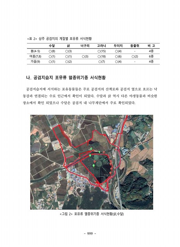 999 수달 삵 너구리 고라니 두더지 등줄쥐 비 고 봄 4-5 ○ 8 ○ 3 ○ 15 ○ 4 4종 여름 7,8 ○ 1 ○ 1 ○ 3 ○ 18 ○ 6 ○ 2 6종 가을 9 ○ 1 ○ 2 ○ 7 ○ 4 4종 표 2 상주 공검지의 계절별 포유류 서식현황 나. 공검지습지 포유류 멸종위기종 서식현황 공검지습지에 서식하는 포유동물들은 주로 공검지의 산책로와 공검지 옆으로 흐르는 낙 동강과 연결되는 수로 인근에서 확인이 되었다. 수달과 삵 역시 다른 야생동물과 비슷한 장소에서 확인 되었으나 수달은 공검지 내 나무계단에서 주로 확인되었다. 그림 2 포유류 멸종위기종 서식현황 삵,수달