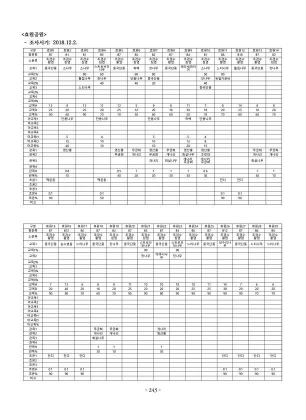 효원공원 조사시기2018.12.2. 구분 효원1 효원2 효원3 효원4 효원5 효원6 효원7 효원8 효원9 효원10 효원11 효원12 효원13 효원14 중분류 B7 B1 B1 B3 B7 B5 B2 B7 B4 B1 B6 B10 B7 B2 소분류 조경수 활엽 조경수 침엽 조경수 침엽 조경수 침엽 조경수 활엽 조경수 침엽 조경수 침엽 조경수 활엽 조경수 침엽 조경수 침엽 조경수 활엽 조경수 활엽 조경수 활엽 조경수 침엽 교목1 중국단풍 소나무 소나무 스트로브잣 나무 중국단풍 측백 잣나무 중국단풍 메타세콰이 어 소나무 느티나무 튤립나무 중국단풍 잣나무 교목1% 80 60 60 80 50 90 교목2 튤립나무 잣나무 단풍나무 중국단풍 잣나무 독일가문비 교목2% 40 40 20 40 교목3 느티나무 중국단풍 교목3% 교...