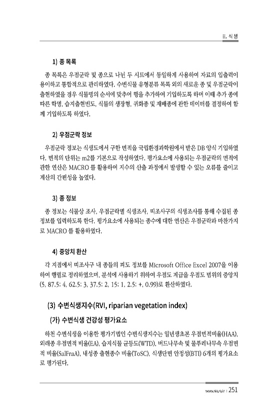 ii. 식 생 www.nie.re.kr ?251 1 종 목록은 우점군락 및 종으로 나뉜 두 시트에서 동일하게 사용하여 자료의 입출력이 용이하고 통합적으로 관리하였다. 수변식물 유형분류 목록 외의 새로운 종 및 우점군락이 출현하였을 경우 식물명의 순서에 맞추어 행을 추가하여 기입하도록 하며 이때 추가 종에 따른 학명, 습지출현빈도, 식물의 생장형, 귀화종 및 재배종에 관한 데이터를 결정하여 함 께 기입하도록 하였다. 2 우점군락 정보는 식생도에서 구한 면적을 국립환경과학원에서 받은 DB 양식 기입하였 다. 면적의 단위는 m2를 기본으로 작성하였다. 평가요소에 사용되는 우점군락의 면적에 관한 연산은 MACRO 를 활용하여 지수의 산출 과정에서 발생할 수 있는 오류를 줄이고 계산의 간편성을 높였다. 3 종 정보는...