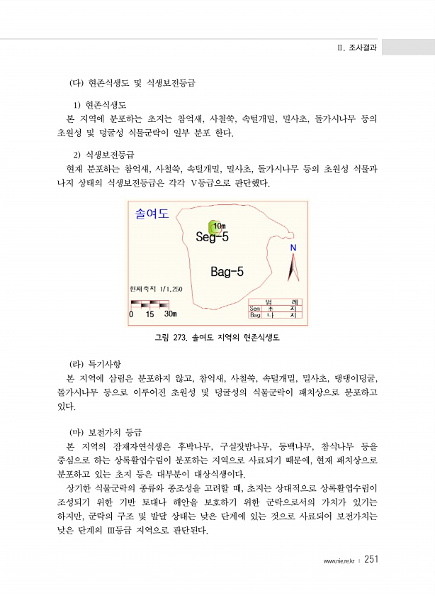 Ⅱ. 조사결과 www.nie.re.kr ? 251 다 현존식생도 및 식생보전등급 1 현존식생도 본 지역에 분포하는 초지는 참억새, 사철쑥, 속털개밀, 밀사초, 돌가시나무 등의 초원성 및 덩굴성 식물군락이 일부 분포 한다. 2 식생보전등급 현재 분포하는 참억새, 사철쑥, 속털개밀, 밀사초, 돌가시나무 등의 초원성 식물과 나지 상태의 식생보전등급은 각각 Ⅴ등급으로 판단했다. 그림 273. 솔여도 지역의 현존식생도 라 특기사항 본 지역에 삼림은 분포하지 않고, 참억새, 사철쑥, 속털개밀, 밀사초, 댕댕이덩굴, 돌가시나무 등으로 이루어진 초원성 및 덩굴성의 식물군락이 패치상으로 분포하고 있다. 마 보전가치 등급 본 지역의 잠재자연식생은 후박나무, 구실잣밤나무, 동백나무, 참식나무 등을 중심으로 하는 상록활엽수림이 ...