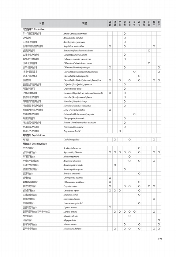 259 딱정벌레과 Carabidae 우수리둥글먼지벌레 Amara Amara ussuriensis ○ 먼지벌레 Anisodactylus signatus ○ 노란테먼지벌레 Anoplogenius cyanescens ○ 줄딱부리강변먼지벌레 Asaphidion semilucidum ○ ○ ○ 볕강먼지벌레 Bembidion Peryphus scopulinum ○ 노랑머리먼지벌레 Calleida Callidiola lepida ○ 풀색명주딱정벌레 Calosoma inquisitor cyanescens ○ 민무늬먼지벌레 Chlaenius Chlaeniellus ocreatus ○ 쌍무늬먼지벌레 Chlaenius llaenchus naeviger ○ ○ ○ 아이누길앞잡이 Cicindela Cicindela gemmata ...