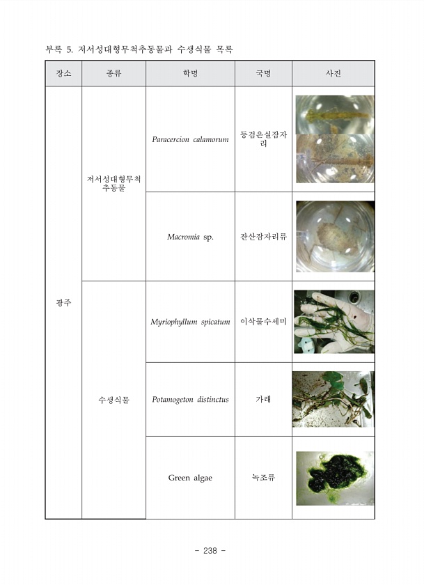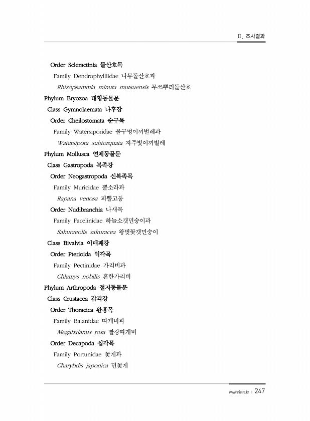 Ⅱ. 조사결과 www.nie.re.kr ? 247 Order Scleractinia 돌산호목 Family Dendrophylliidae 나무돌산호과 Rhizopsammia minuta mutsuensis 무쓰뿌리돌산호 Phylum Bryozoa 태형동물문 Class Gymnolaemata 나후강 Order Cheilostomata 순구목 Family Watersiporidae 물구멍이끼벌레과 Watersipora subtorquata 자주빛이끼벌레 Phylum Mollusca 연체동물문 Class Gastropoda 복족강 Order Neogastropoda 신복족목 Family Muricidae 뿔소라과 Rapana venosa 피뿔고둥 Order Nudibranchia 나새목 Family Facelini...